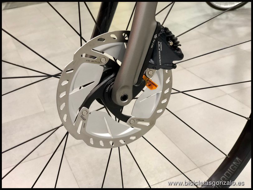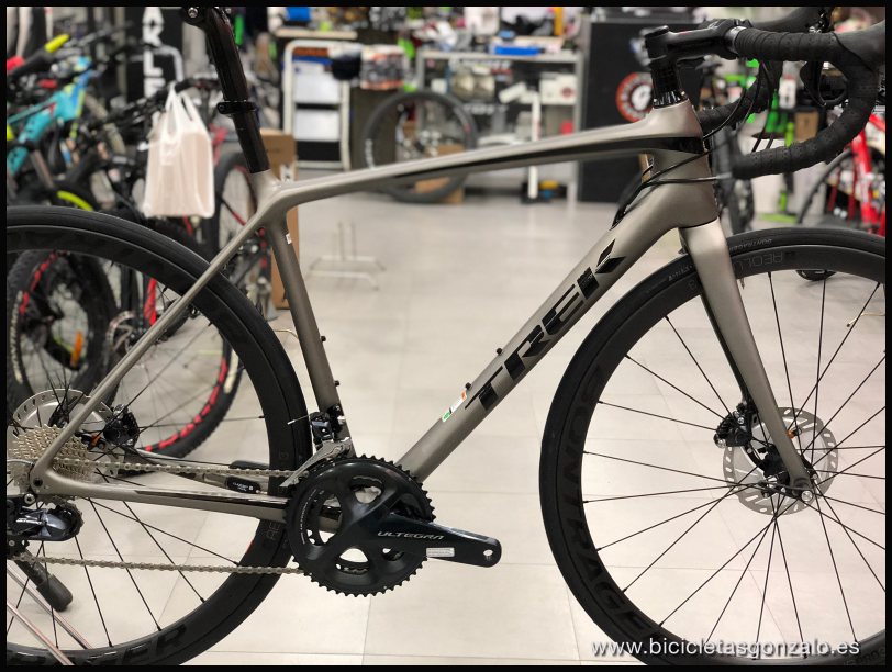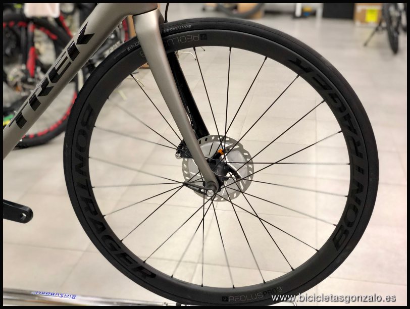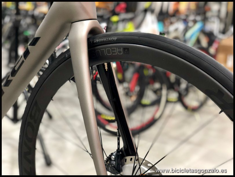 Estética finísima. Al fondo de la imagen tenemos la misma bici pero con las ruedas Bontrager Aeolus Pro Disc de carbono.