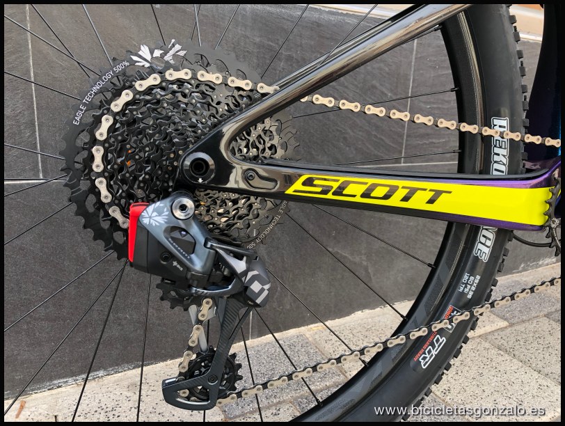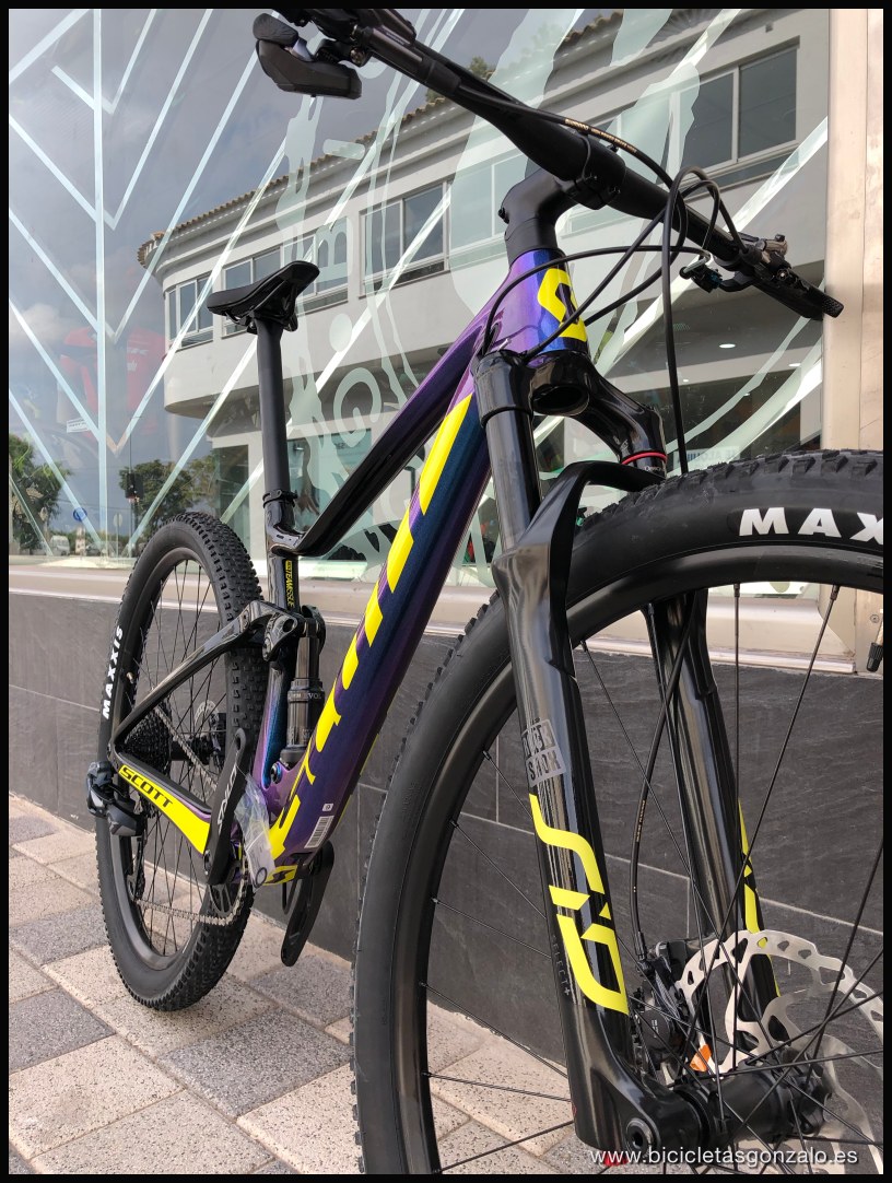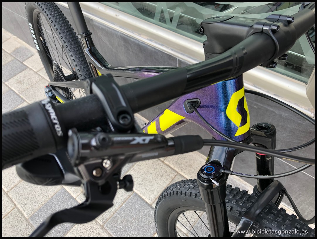 Un nuevo modelo se añade a la de ya por si completa colección de Scott en su familia más racing, la Spark RC. Un color "camaleón" muy guapo que oscila de azul a morado según lo mires. Una transmisión electrónica de Sram y unos potentes frenos XT para redondear el montaje. Este cuadro se fabrica con el carbono HMF y lleva el sistema de control de suspensión Twinloc, que os puedo decir que es el mejor sistema del mercado que puede llevar una doble suspensión. Con un solo mando controlas las 2 suspensiones con una posición central que evita que contamine el pedaleo y cambia el recorrido de 100mm a 70 mm. Unas fotos y un video de esta bici de 4999€ de PVP
