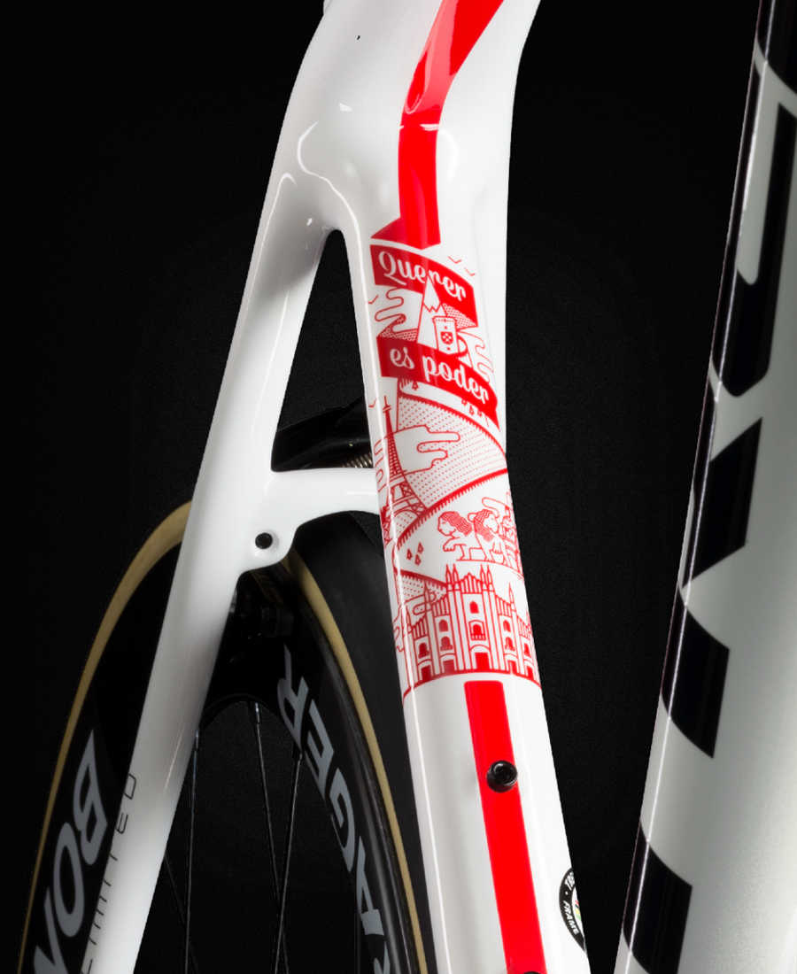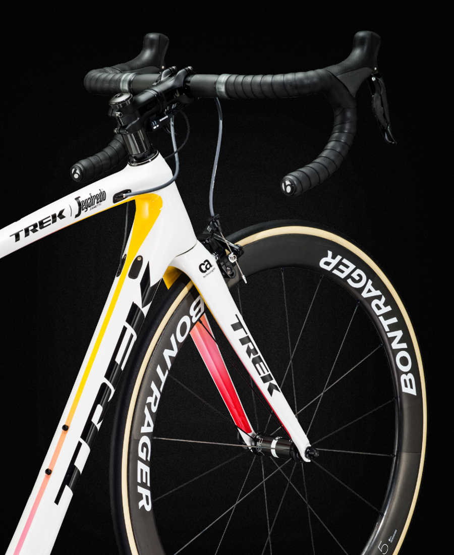 Este nuevo diseño, que ya está disponible para la Émonda SLR con Project One, hace honor a los legendarios logros de Contador. El color blanco y el oro se combina con toques de rojo, amarillo y rosa, los colores que hacen referencia a los maillots de líder que ha vestido el ganador de tres grandes vueltas. El diseño de colores en el tubo del sillín destaca los hitos más importantes del Tour, Giro y Vuelta, así como escenas de Pinto, el pueblo donde nació Alberto.